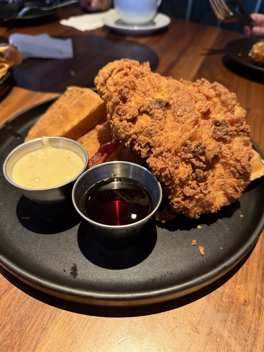 I need the gold giraffe lamp! Ugh. Other than that, this gorgeous restaurant is serving up a wide range of cultural inspired flavors sure to pique the interest of any foodie adventurer. For this trip, we did breakfast for my dad's birthday and after listening to his travel stories throughout Europe, it was time to order food. THE BREAKFAST FOOD. - Rock Shrimp Beignets | Served with spicy harissa remoulade, these bite-sized beignets were lightly crispy outside and plumpy little shrimps inside. Great appetizer to start things off! - French Toast | Thicc brioche bread with an even coating of batter and powdered sugar sprinkled on top. We poured a little syrup on top and shared this dish because we had other things to pig out on. - Fried Chicken & Waffles | The fried chicken here is tender, juicy, and crispy in all the right places. Waffles are buttery and slightly sweet. And their crispy bacon adds that next level of oink we don't need but it enhances the dish so we'll take it. - Fried Chicken & Eggs | If I could just highlight the sausage gravy for a moment here because I've already doted on their fried chicken in the previous dish. The gravy had a butteriness to it that complimented the savory sausage flavor so well, while the pepper seasoning cut through the richness just enough. The consistency was creamy and a perfect sauce to dip everything into. Highly recommend this dish. - Spanish Skillet | Loved all the vegetables in this dish and cracking a couple of over easy eggs on top just livens up the breakfast experience even more. It comes with a side of toast, and if you aren't dipping that into your egg yolks, then dip it into that sausage gravy, lol. THE DRUNK DRINKS. - Mint Julep | A lovely refreshing cocktail with bourbon, mint, and simple syrup. My only complaint is the paper straw that can only handle a few sips before withering up and dying in your drink. THE PARKING. Parking is free and not difficult to find an open spot, but it may depend on time of day. THE RESERVATION DETERMINATION. YES, make reservations. You don't want to wait there while everyone else walks past you because they made a reservation and you didn't.